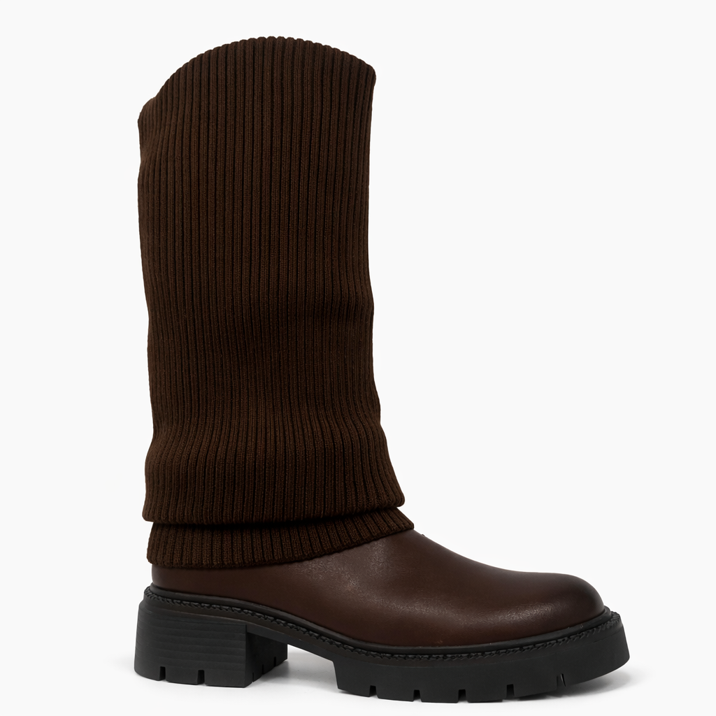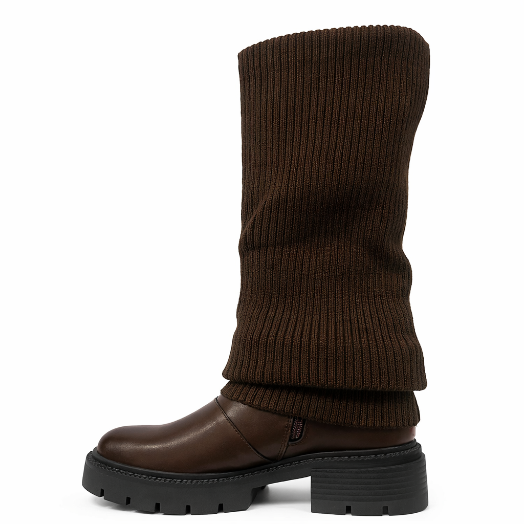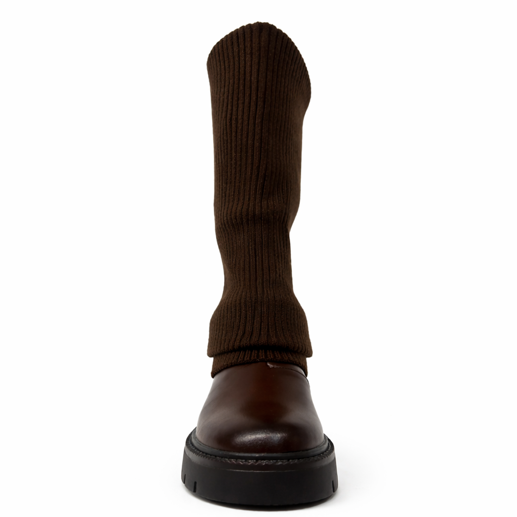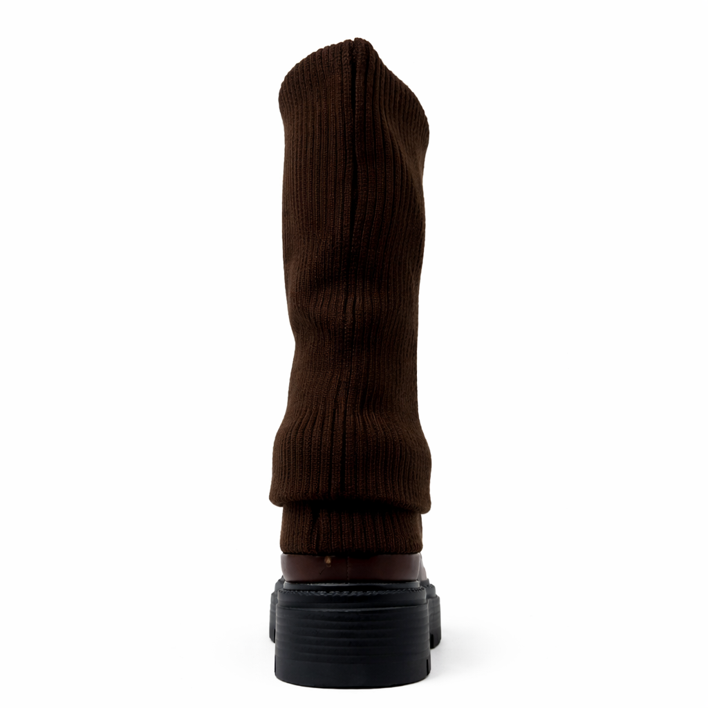 La parte superiore in maglia elasticizzata segue la gamba con naturalezza, creando un effetto morbido e raffinato, mentre la base strutturata dona carattere e solidità al design.