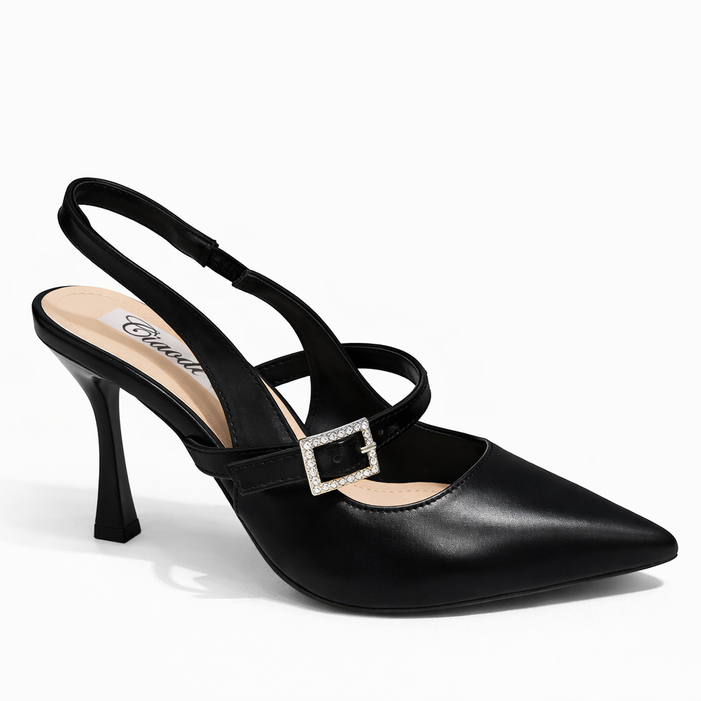 La silhouette con punta affusolata valorizza la linea del piede, mentre il cinturino superiore con fibbia gioiello aggiunge un dettaglio luminoso e sofisticato che rende il modello ancora più distintivo.