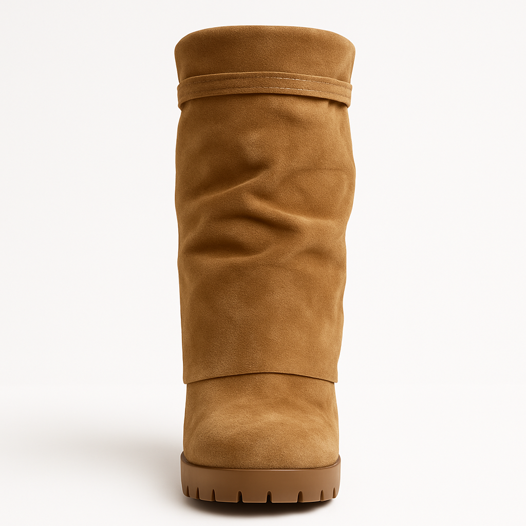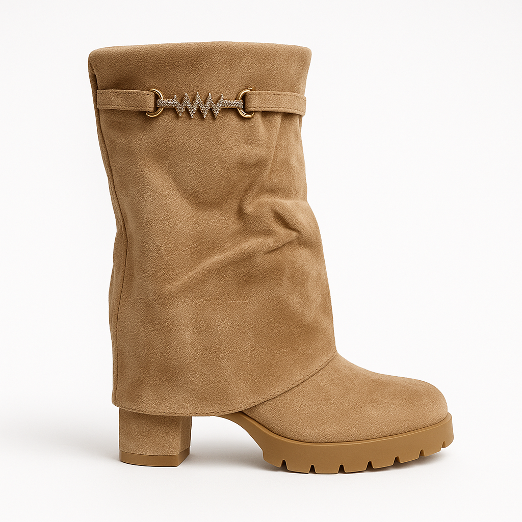 La tomaia morbida effetto scamosciato avvolge la gamba con naturalezza, mentre il dettaglio gioiello luminoso applicato sul gambale aggiunge un tocco sofisticato e distintivo. La suola strutturata garantisce stabilità e comfort, rendendo questo modello ideale per essere indossato tutto il giorno.