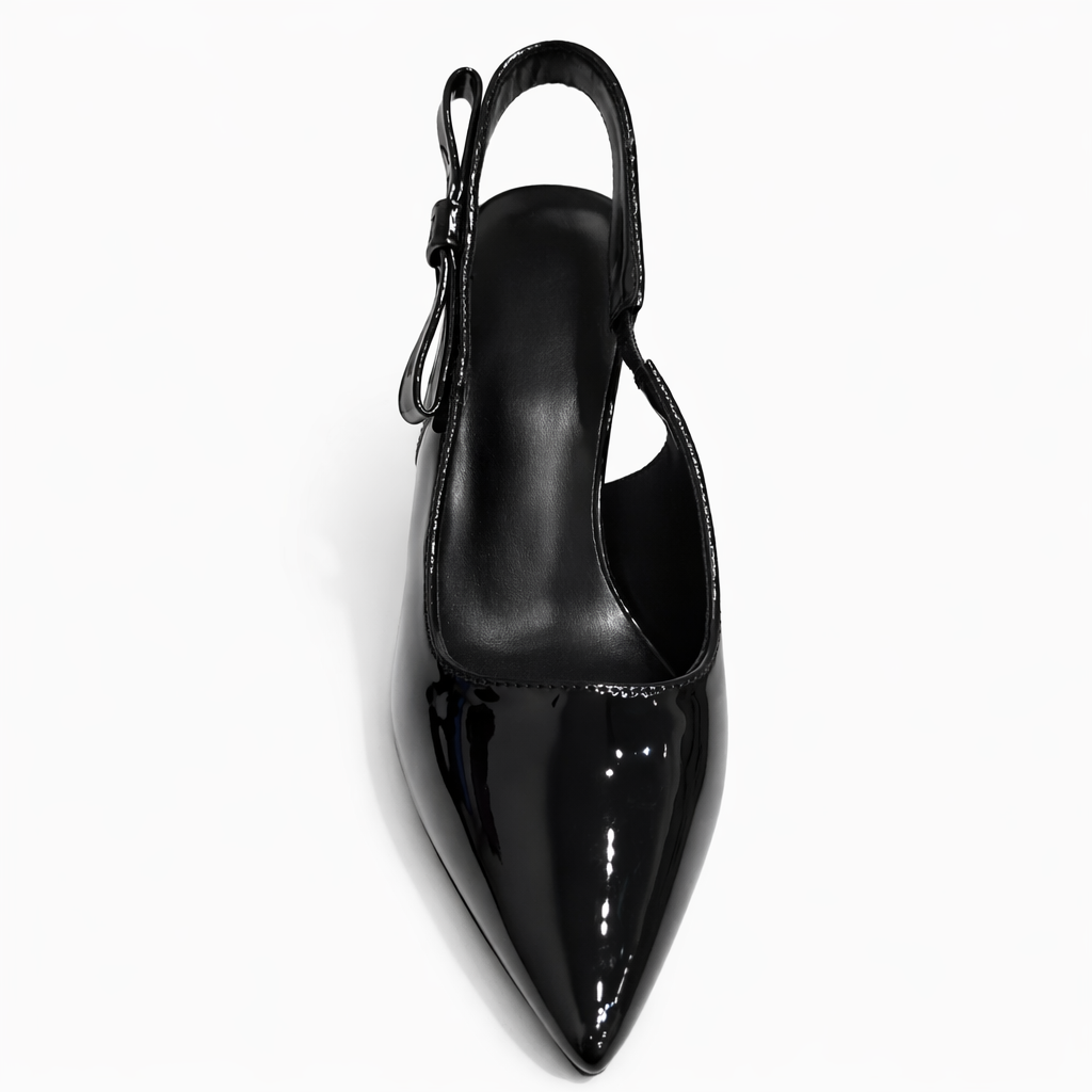 Décolleté slingback nero lucido con fiocco.Un grande classico reinterpretato con carattere.