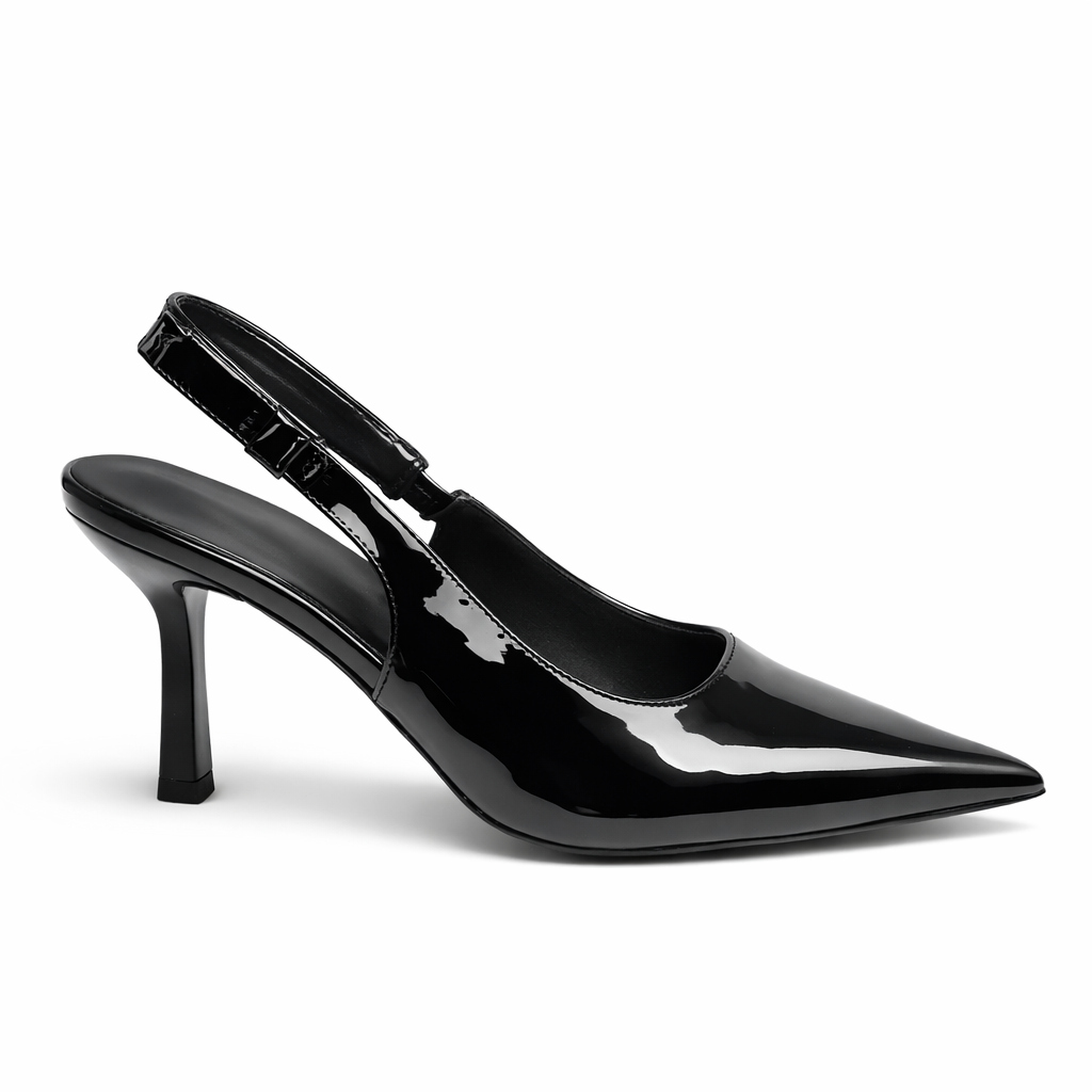 Questo décolleté slingback nero lucido è la scelta ideale per chi ama uno stile elegante, deciso e senza tempo.