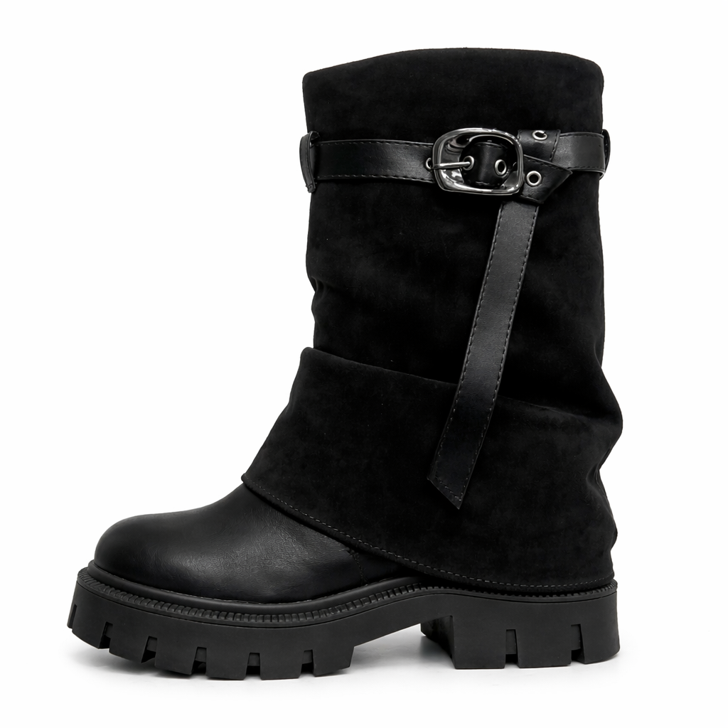 La tomaia combina superfici lisce e morbide, arricchite da una fibbia laterale metallica che dona carattere e personalità al design. La suola carrarmata importante garantisce stabilità e sicurezza su ogni superficie, rendendo questo modello ideale per affrontare la città in ogni momento della giornata.
