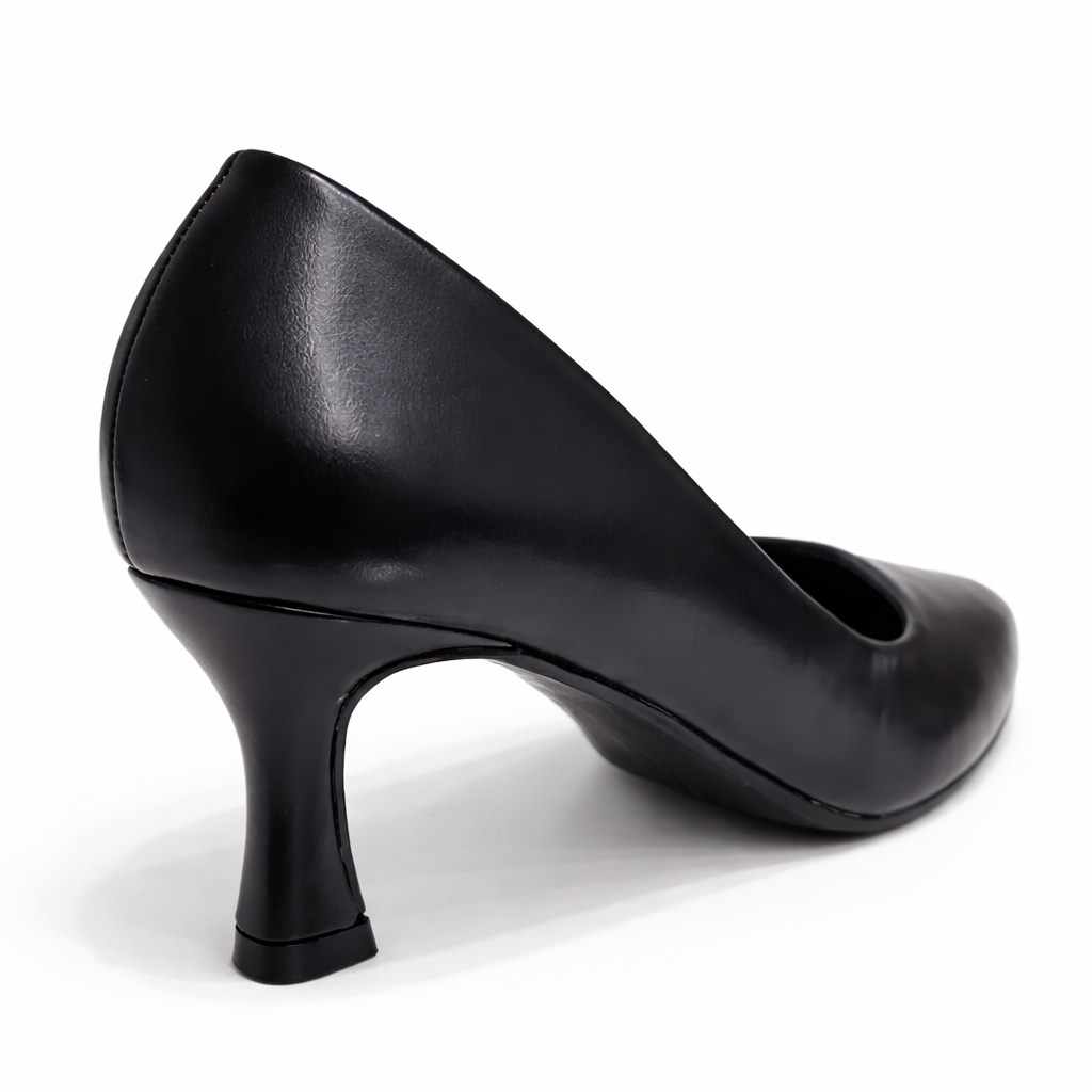 La punta affusolata slancia il piede con naturalezza, mentre il tacco medio elegante garantisce stabilità e comfort, rendendolo perfetto da indossare tutto il giorno, dall’ufficio agli impegni serali. La finitura liscia e raffinata dona un look curato e versatile, ideale per chi ama uno stile sobrio ma sempre impeccabile.
