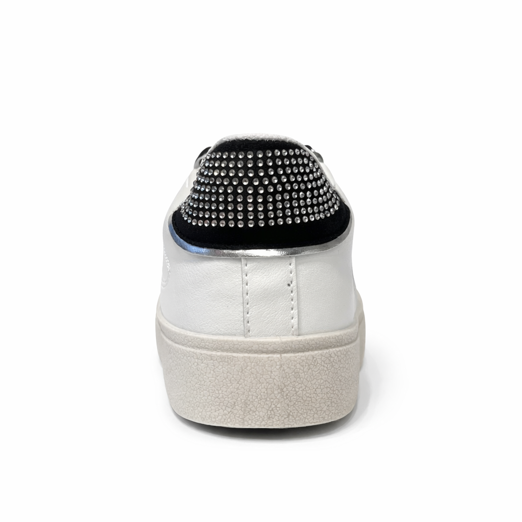 Sneakers da donna dallo stile grintoso e contemporaneo, pensata per chi ama distinguersi con dettagli decisi ma raffinati. La tomaia bianca è impreziosita da inserti neri glitterati e micro-borchie laterali che donano carattere e luminosità al design.
