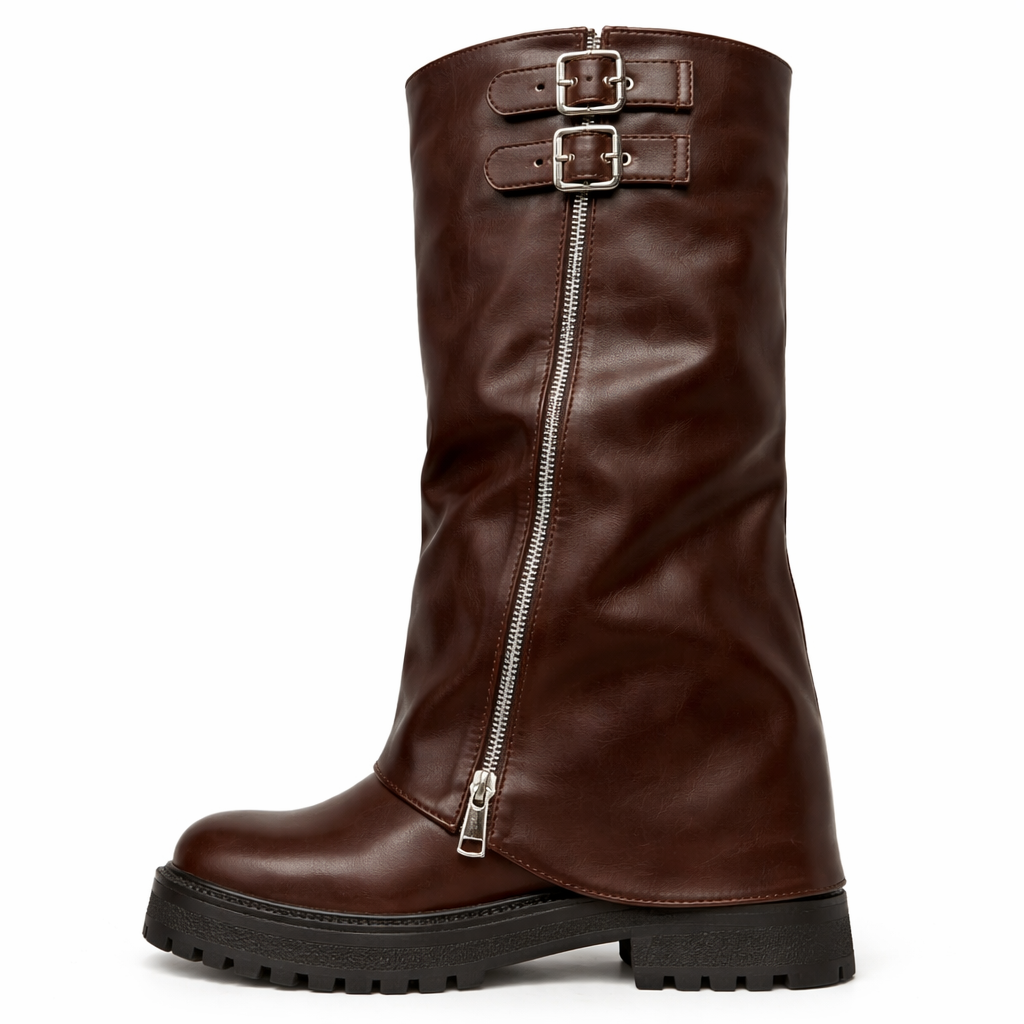La tomaia liscia è valorizzata dalla zip frontale che slancia la figura e dalle doppie fibbie metalliche sul gambale, dettagli che richiamano un’estetica biker raffinata ma equilibrata. La suola strutturata dona stabilità e comfort, rendendolo ideale per l’uso quotidiano senza rinunciare allo stile.