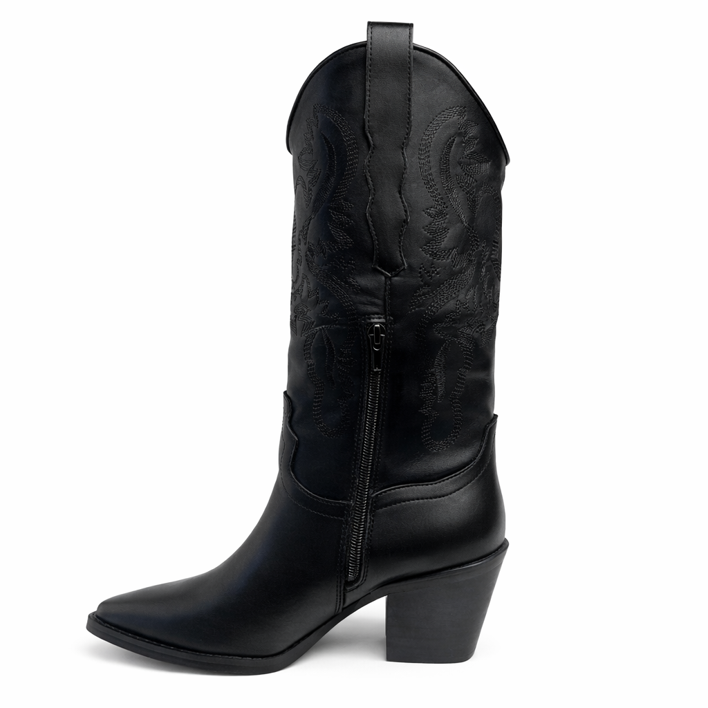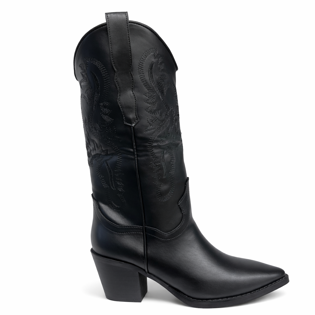 La tomaia liscia è arricchita da ricami tono su tono sul gambale, discreti ma distintivi, che donano profondità e raffinatezza al design. L’altezza leggermente maggiore rispetto ai texani classici slancia la gamba, mentre il tacco medio stabile garantisce comfort e portabilità durante tutta la giornata.