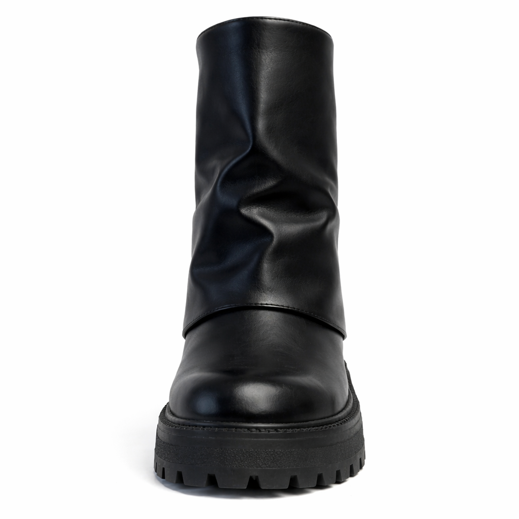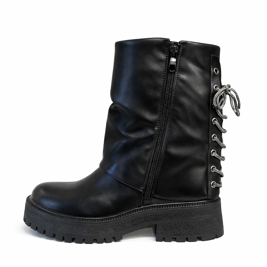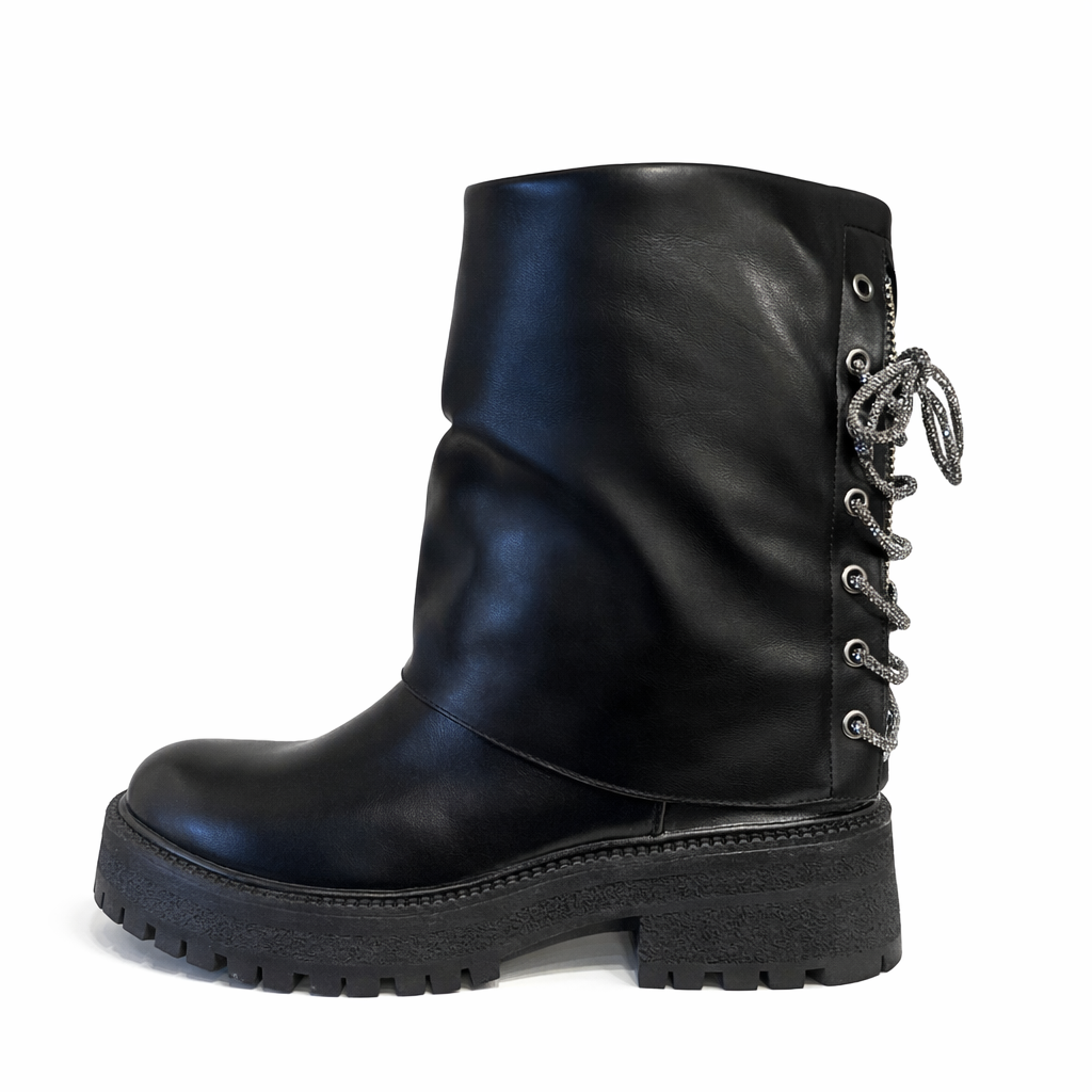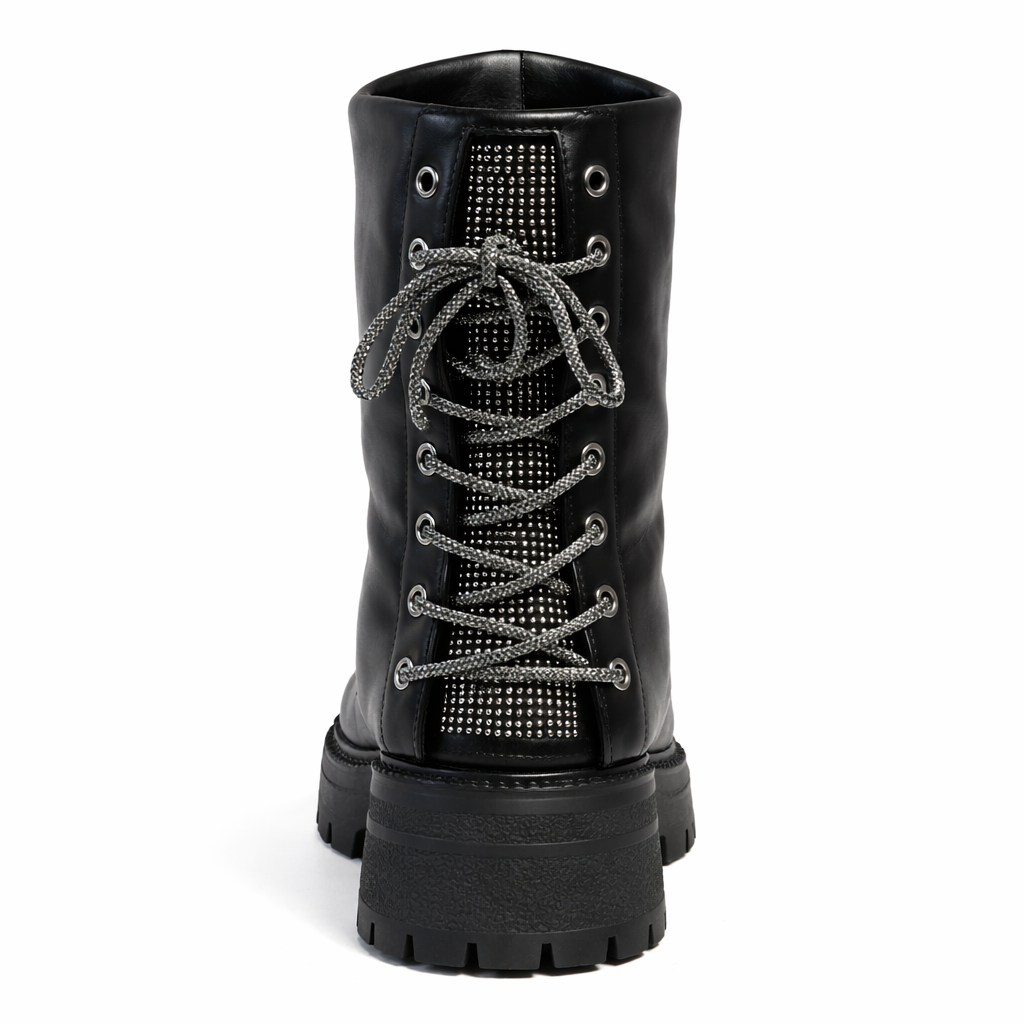La tomaia in nero intenso è valorizzata da una lacciatura frontale gioiello, arricchita da micro strass e dettagli luminosi, che trasformano un classico anfibio in un vero elemento fashion.