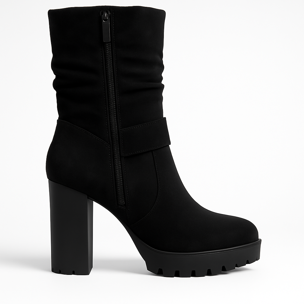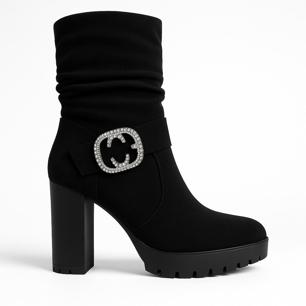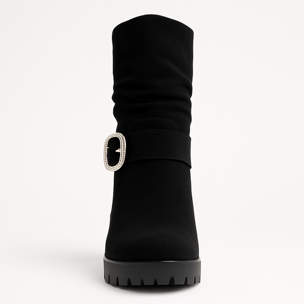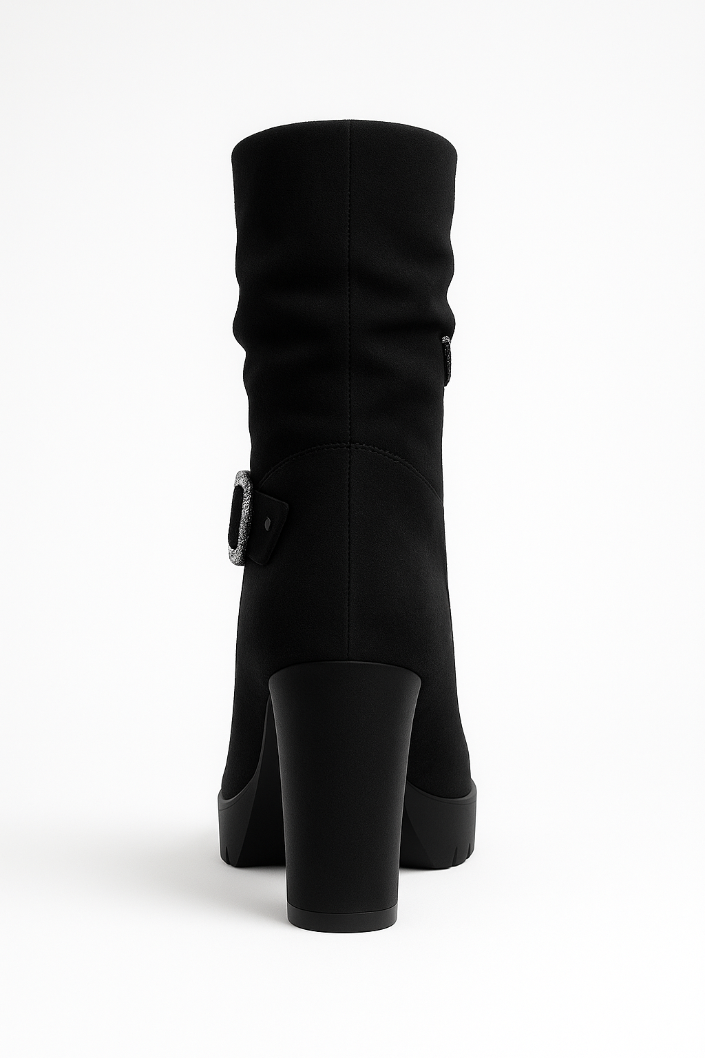 La silhouette slanciata avvolge la gamba con naturalezza, mentre il tacco largo e stabile dona altezza e comfort. Il contrasto tra il nero profondo della tomaia e la fibbia luminosa crea un equilibrio perfetto tra raffinatezza e carattere.