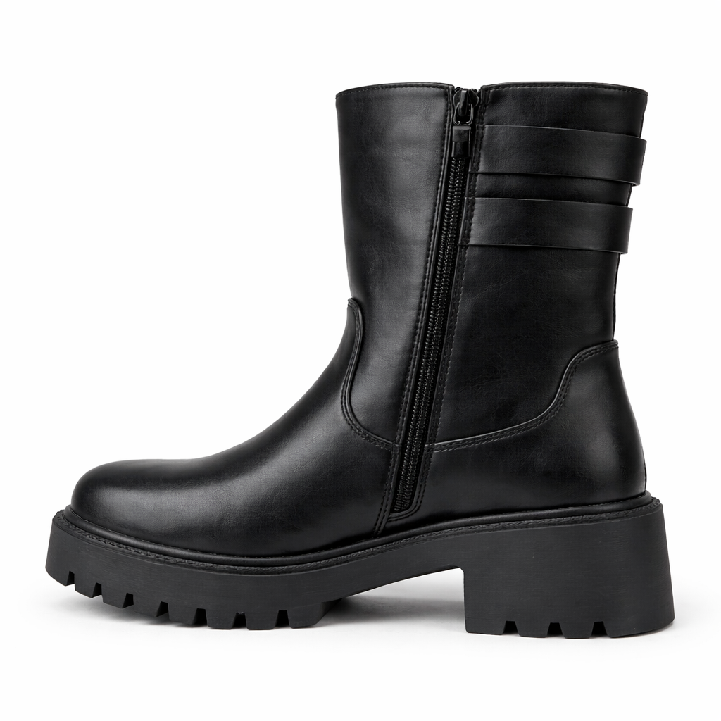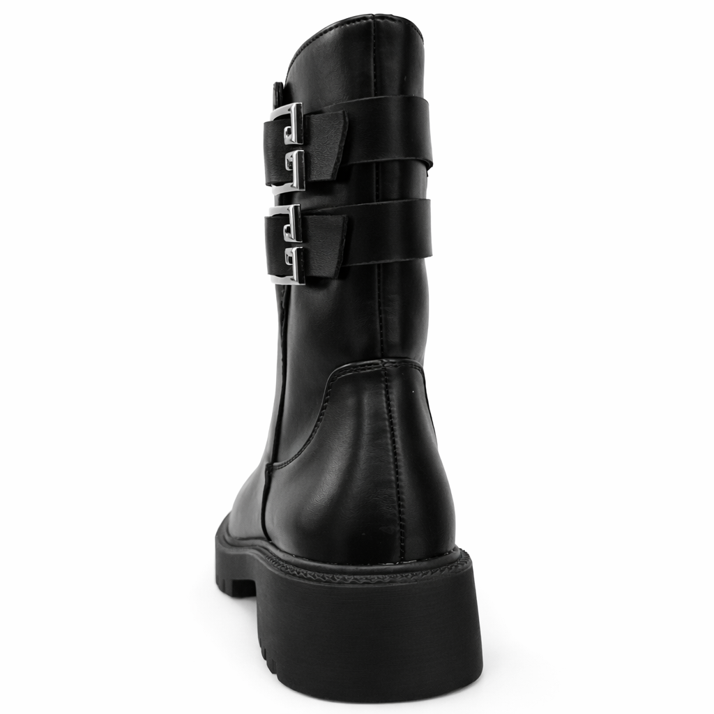 Il biker Raven è un anfibio dal design deciso e contemporaneo, ideale per chi ama uno stile urban strong ma raffinato. La tomaia liscia effetto pelle nera avvolge il piede con una linea pulita, valorizzata dalle doppie fibbie laterali decorative che donano carattere senza appesantire la silhouette.
