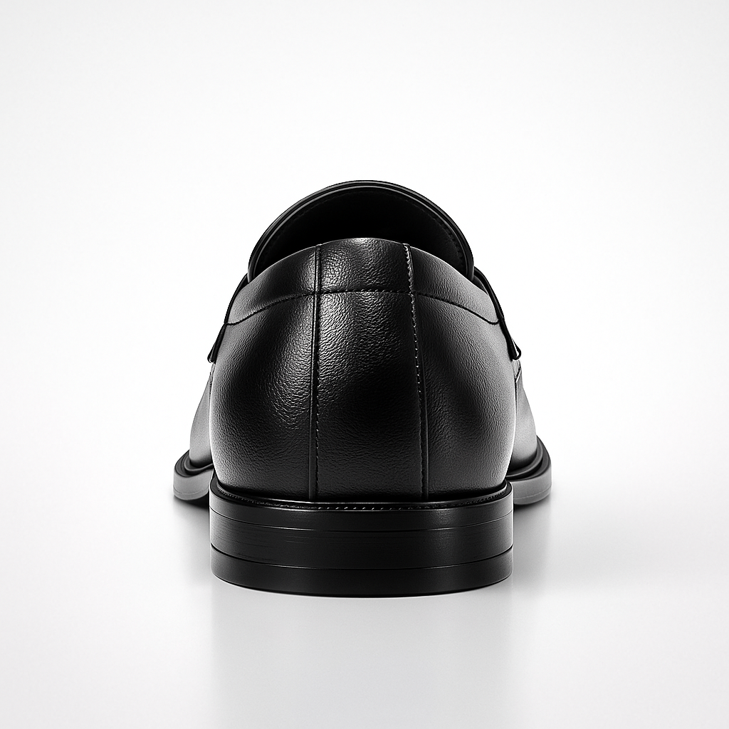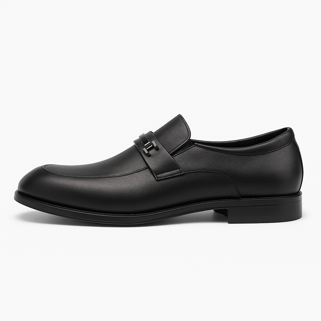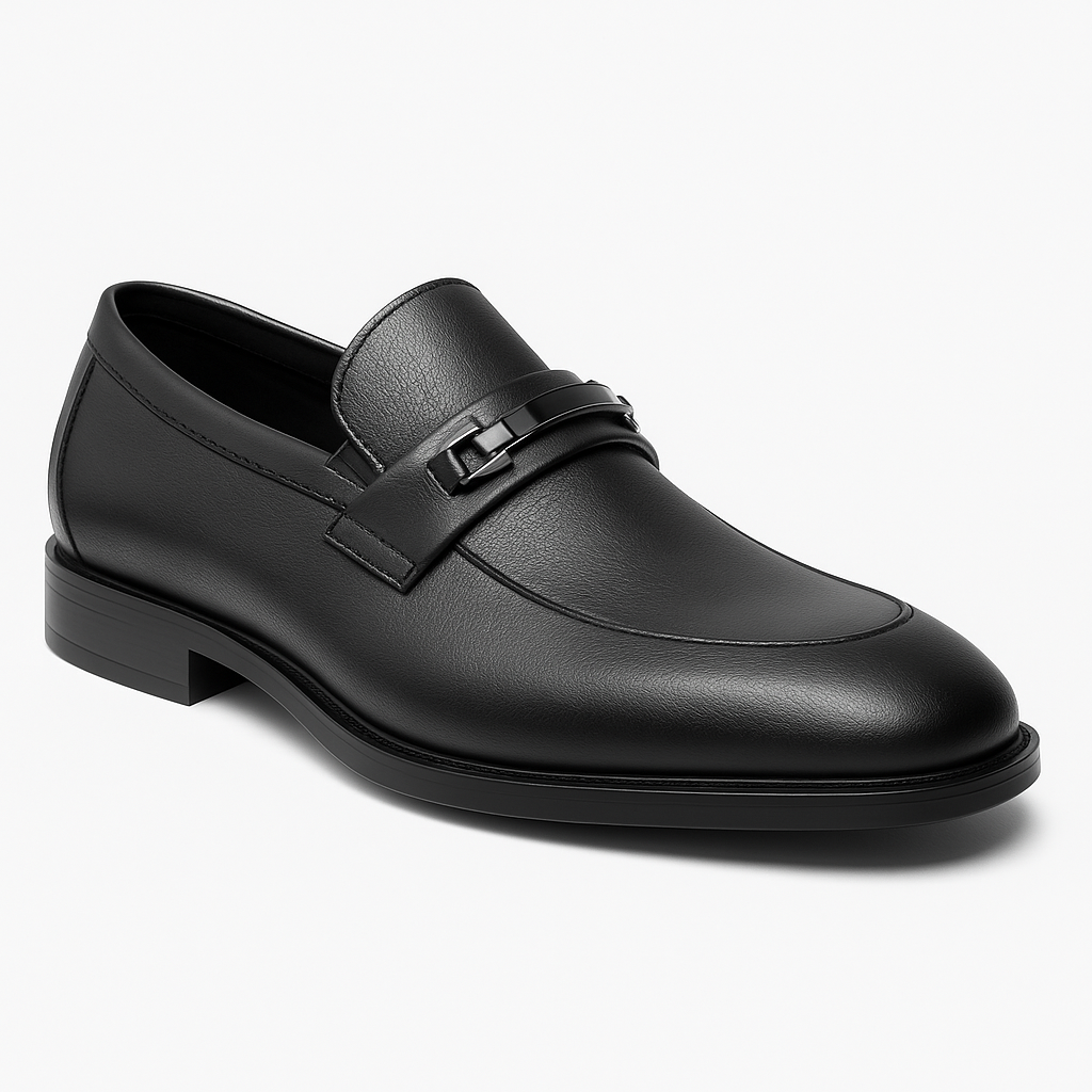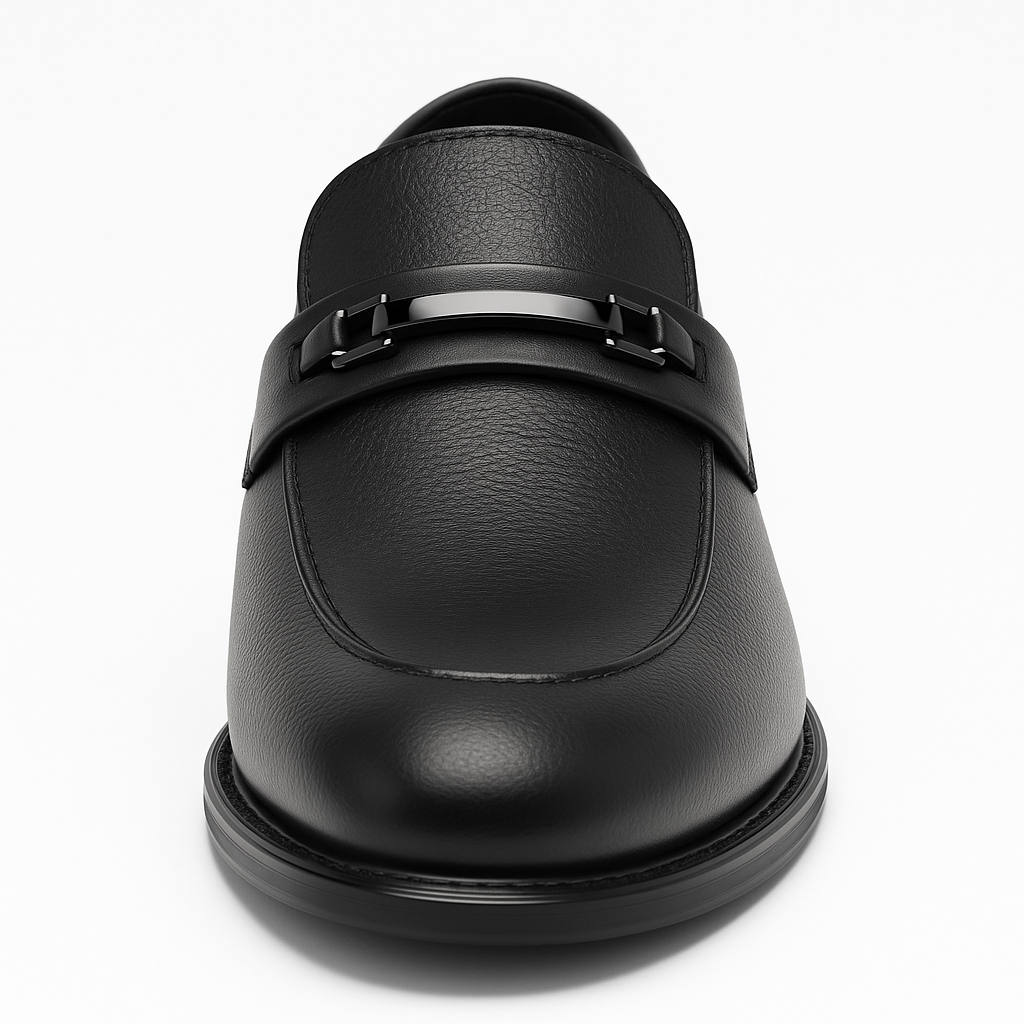 Realizzato in ecopelle liscia nera, si distingue per il dettaglio metallico sul collo del piede, che dona carattere e un tocco moderno alla silhouette classica del mocassino. La linea pulita ed essenziale lo rende estremamente versatile e facile da abbinare.